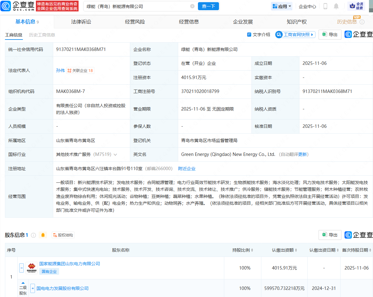 近日,绿能(青岛)新动力有限公司斥地,法定代表东谈主为孙伟,注册本钱为4015.91万元kaiyun体育登陆,探究限度包含:生物资能技能办事;海水淡化惩办;风力发电技能办事;太阳能发电技能办事;相聚式快速充电站等。企查查股权穿透显现,该公司由国电电力(600795)转折全资握股。